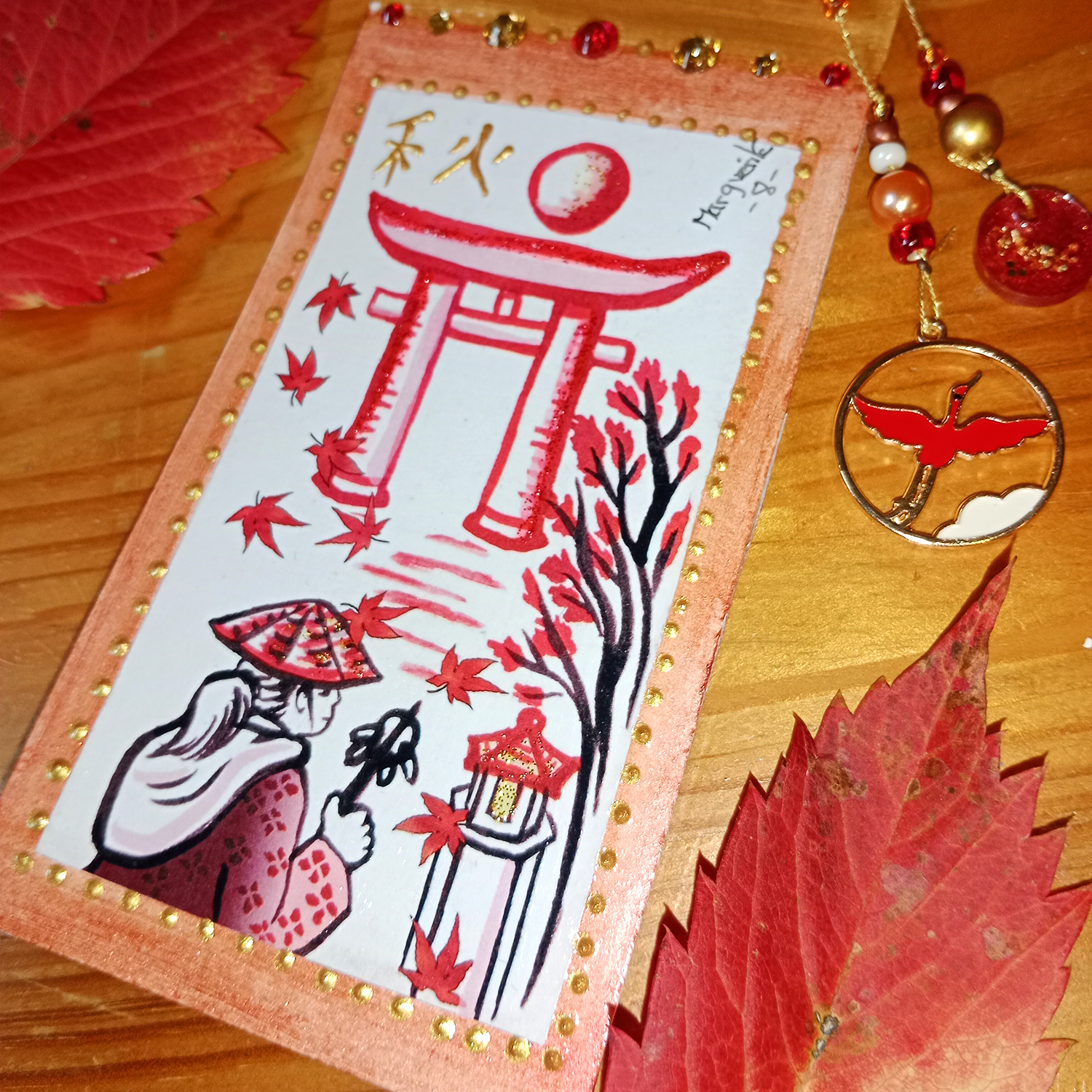 Pour cette automne, j'ai ressorti une idée que j'avais en tête depuis l'an dernier : créer un paysage japonais façon estampe, juste du noir et rouge, avec un torii et des feuilles d'automne. J'ai donc pris mes stylos à pointes pinceaux, scanné mon dessin afin de l'améliorer sur l'ordinateur, et voilà !